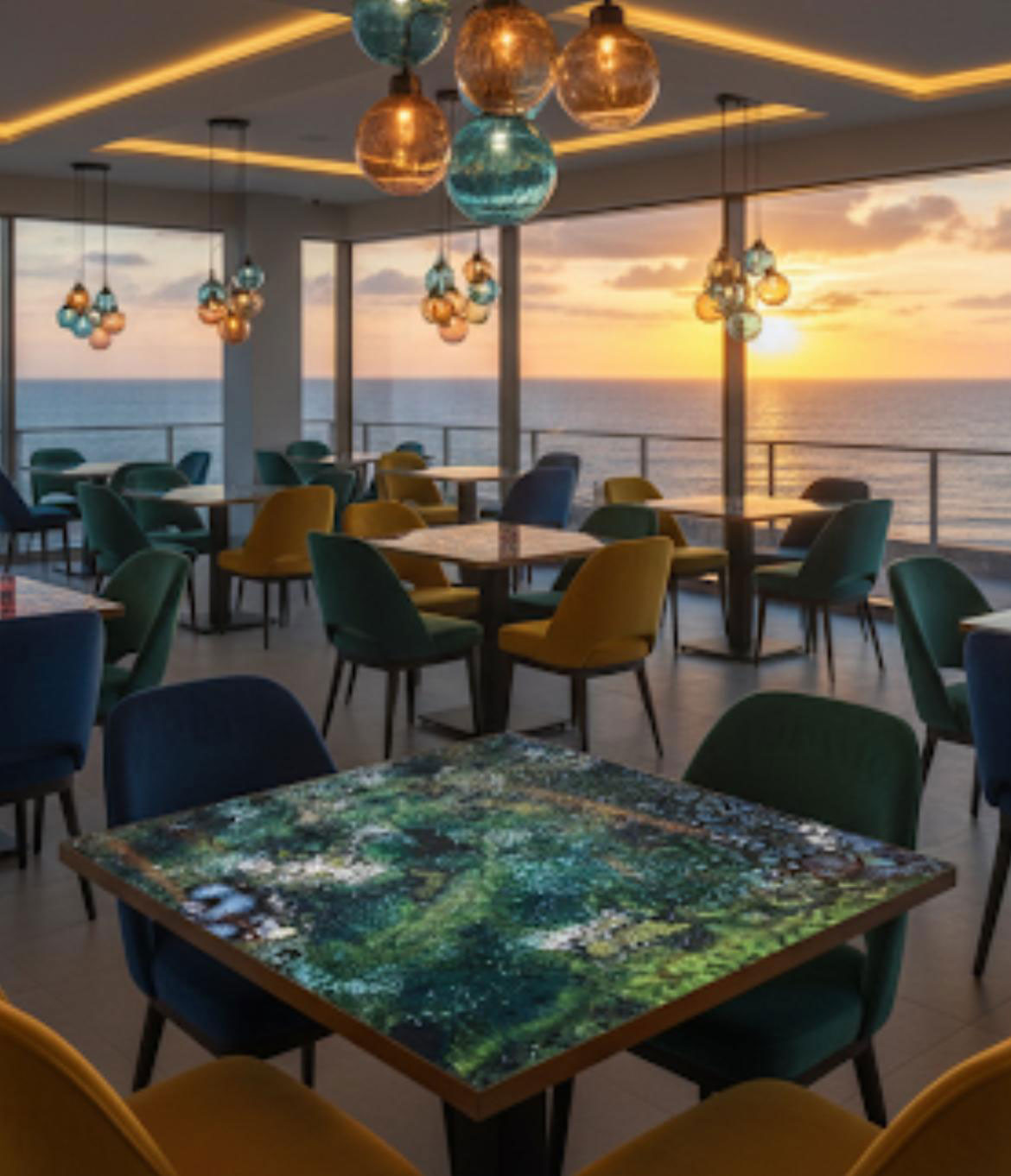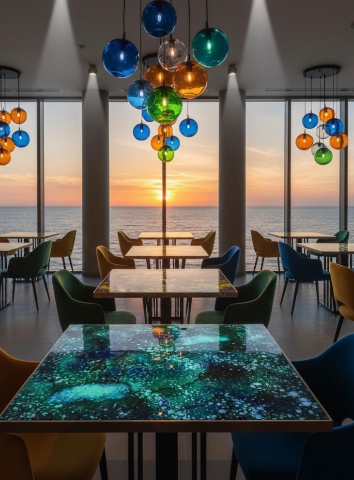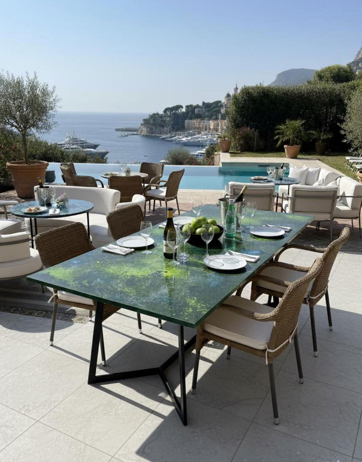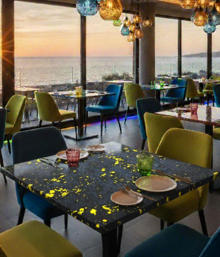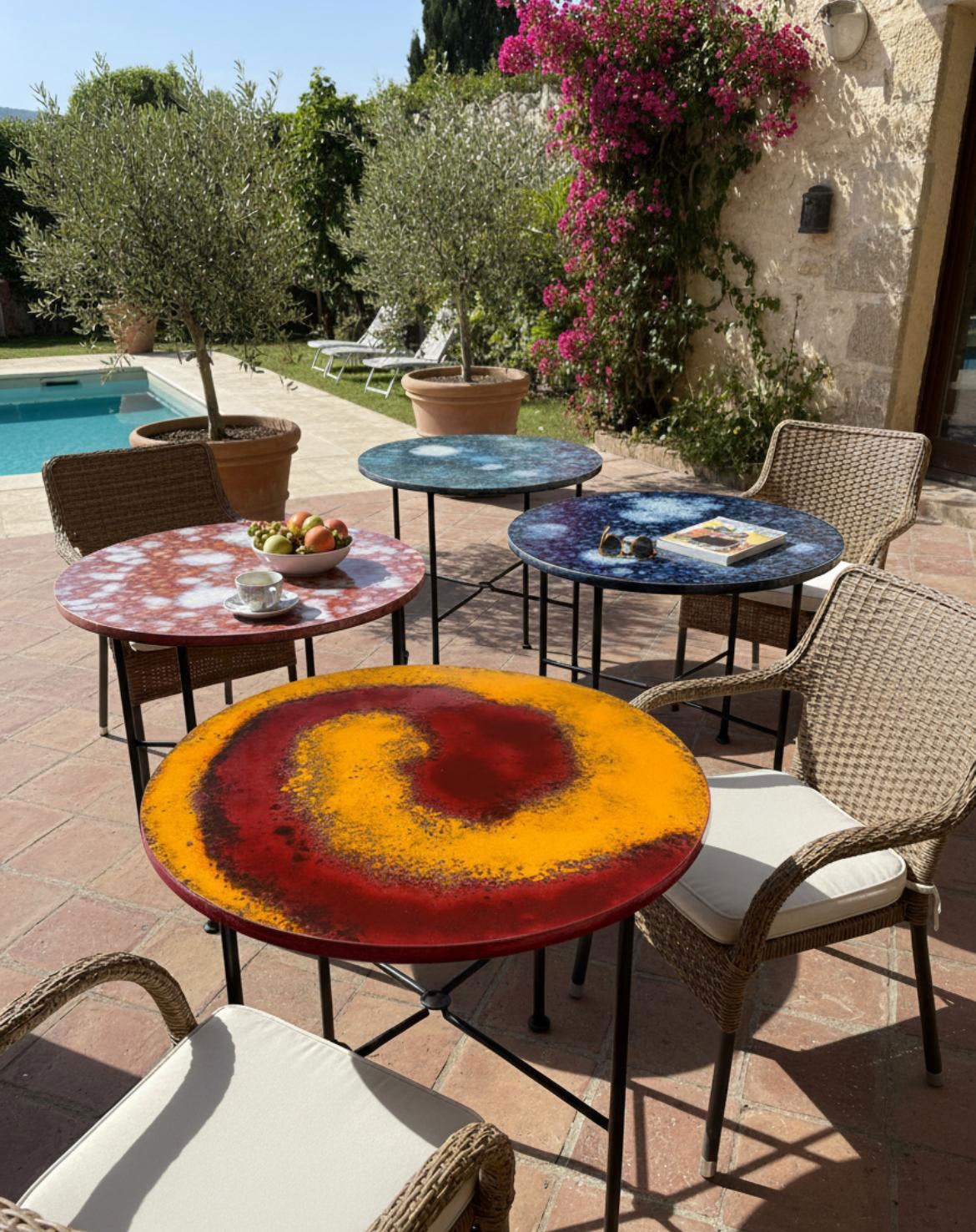 I tavoli in gres porcellanato UNUSLAB sono davvero particolari, con piani che sono opere d’arte in ceramica smaltata, pieni di colore e texture vibranti.