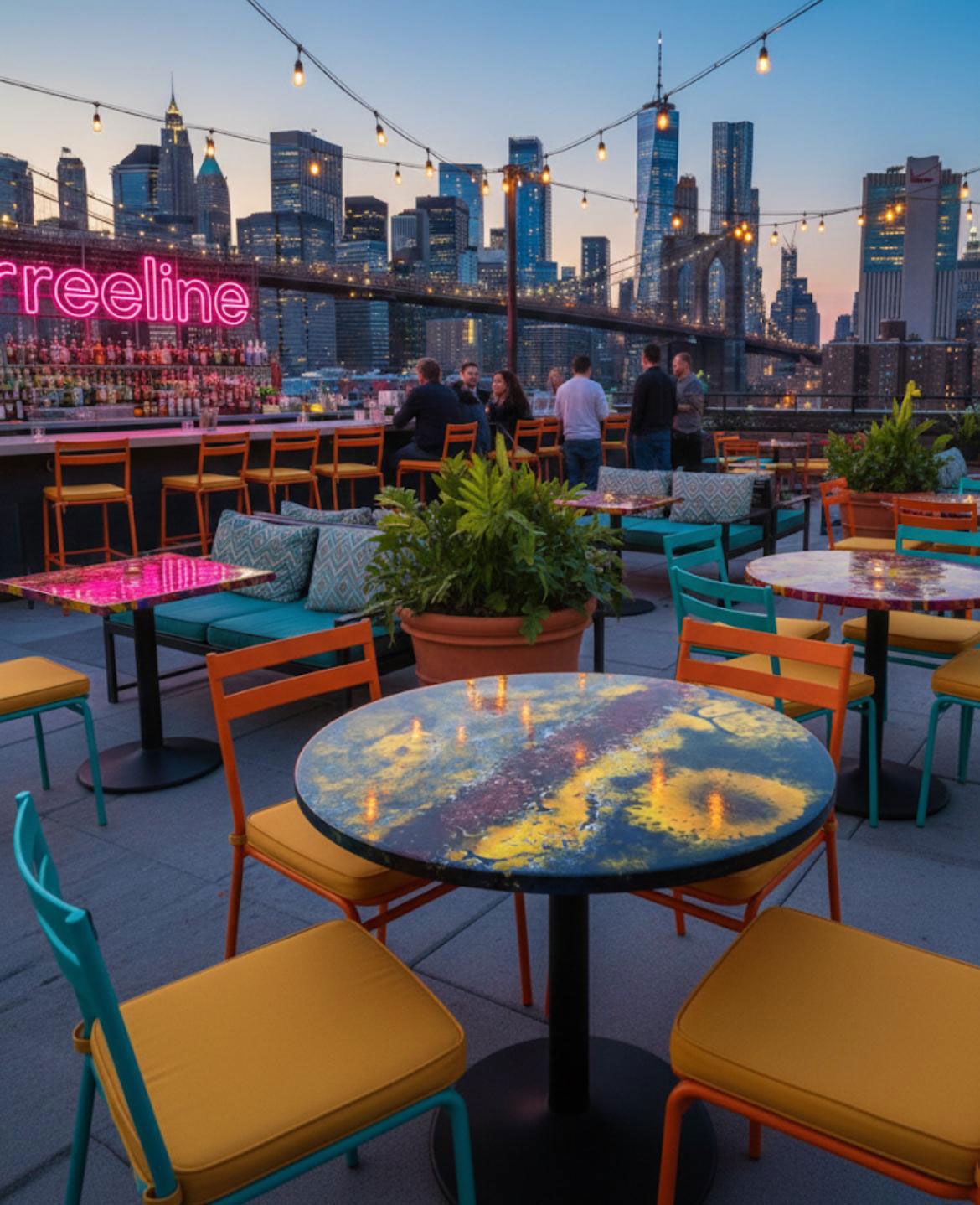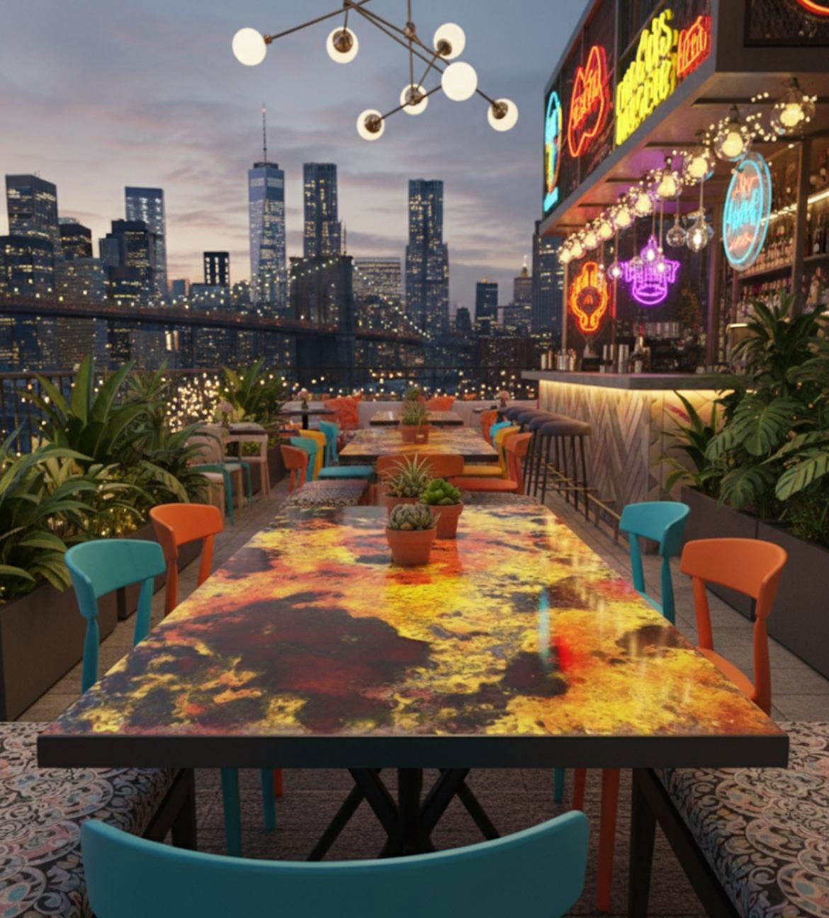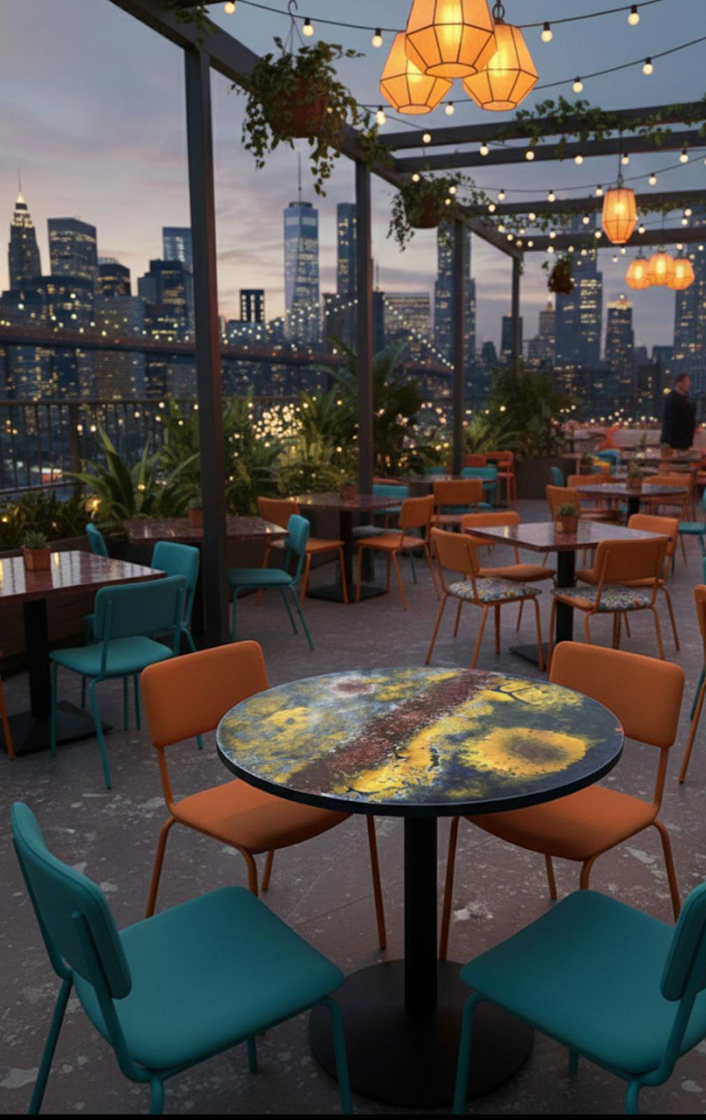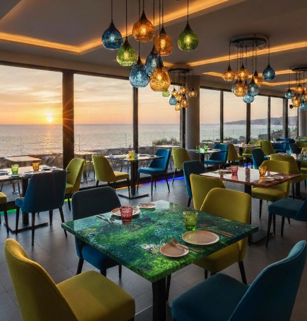 I tavoli in gres porcellanato UNUSLAB sono davvero particolari, con piani che sono opere d’arte in ceramica smaltata, pieni di colore e texture vibranti.