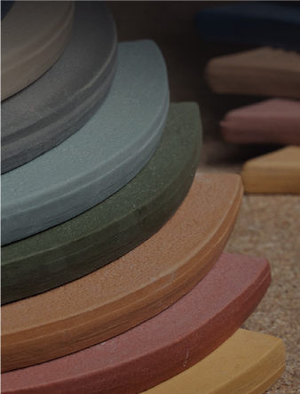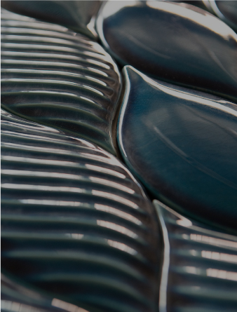 La pigmentazione in spessore abbinata a superfici opache offre tattilità e toni morbidi e caldi, mentre gli smalti lucidi impreziosiscono le superfici lisce ed esaltano la trama di quelle lavorate.